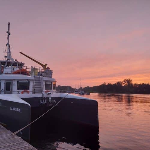 D’une longueur de 25 m et d’une largeur de 6,7 m, le catamaran de recherche de l’Université du Québec à Trois-Rivières (UQTR) a un très faible tirant d’eau (0,9 m) et est équipé d’un chalut de pêche. Ces caractéristiques lui permettent d’échantillonner autant les habitats riverains de faible profondeur que les zones profondes à fort courant de la voie maritime et du bas du fleuve.